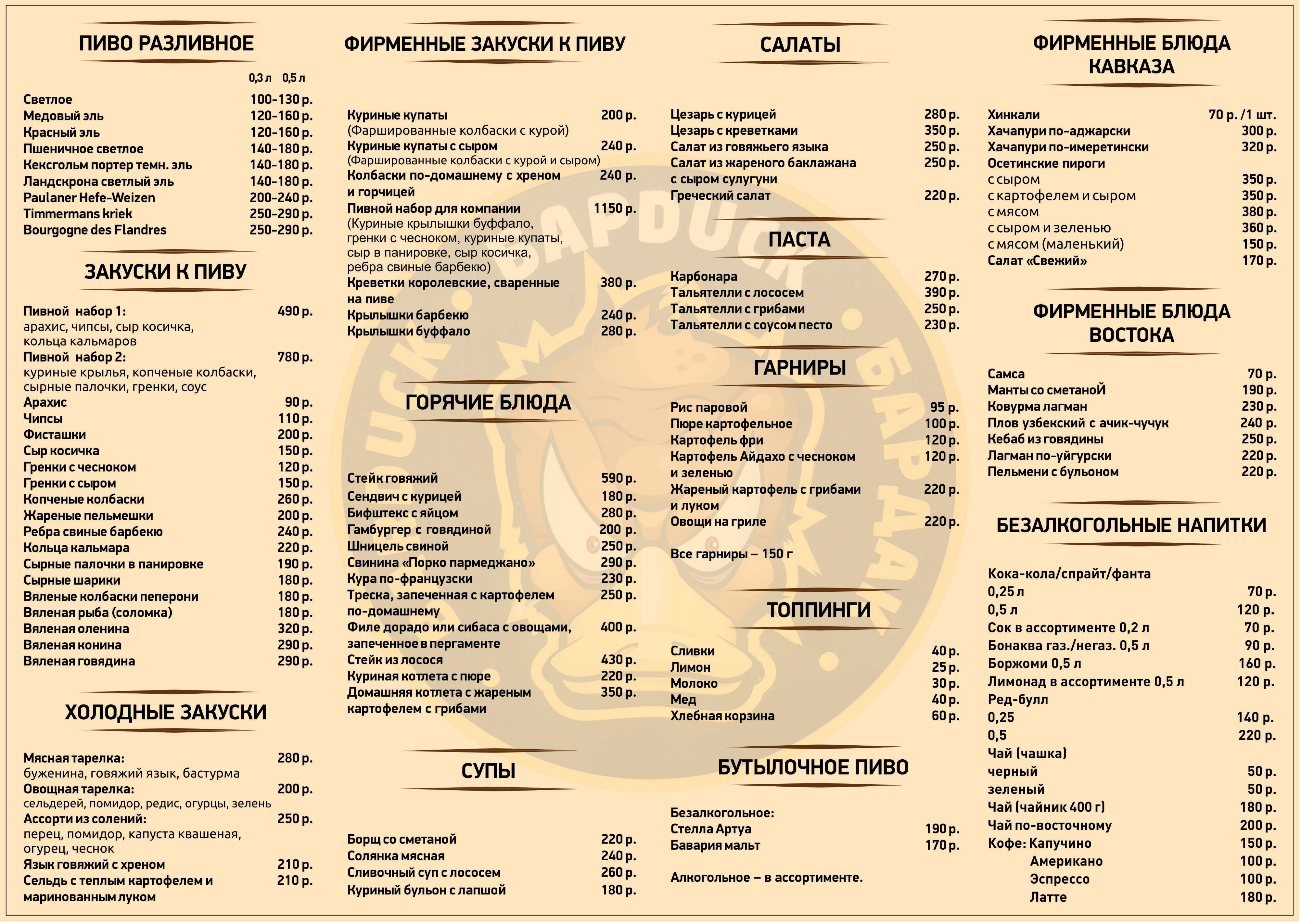 В меню представлена обширная пивная карта, большой набор закусок к пиву — как привычных, так и авторских, представленных только в этом кафе. Здесь имеется множество горячих мясных блюд, гарниров и холодных закусок. Отдельными графами в меню идут блюда Кавказа, восточные кушанья и итальянская паста.