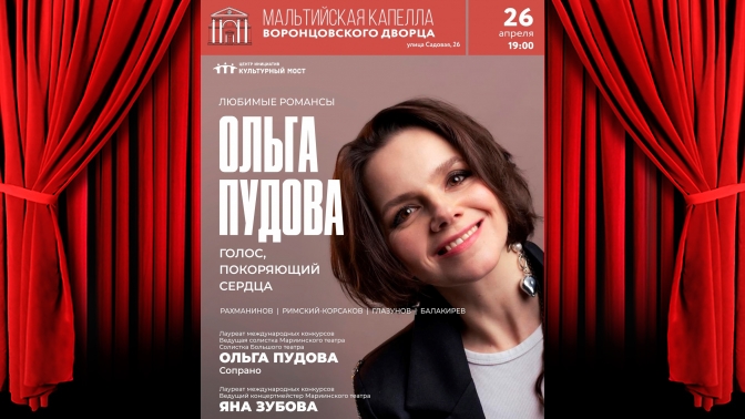 — Скидка 25% на концерт «Ольга Пудова. Голос, покоряющий сердца» (билет номиналом 2100 руб.) (315 руб. + доплата 1260 руб. вместо 2100 руб.)