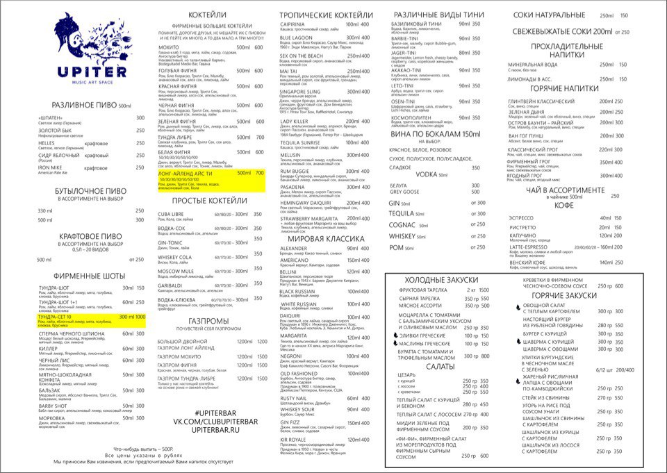 На странице бара в социальной сети можно ознакомиться с афишей мероприятий, почитать подробную информацию о каждом коллективе и выбрать то, что вам по душе. Отдыхайте с удовольствием!