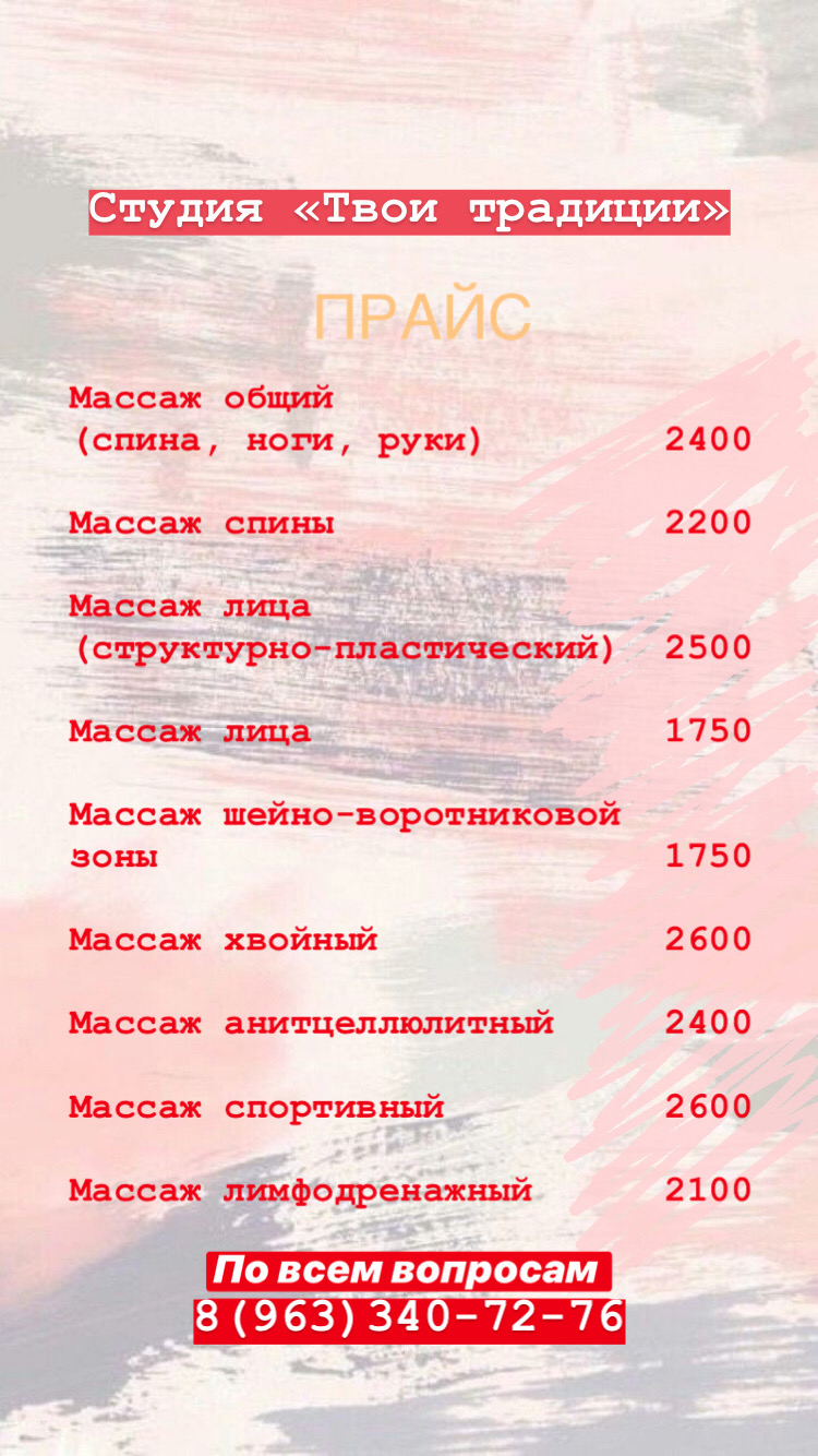— общий массаж (спина, ноги, руки) — 60 минут;